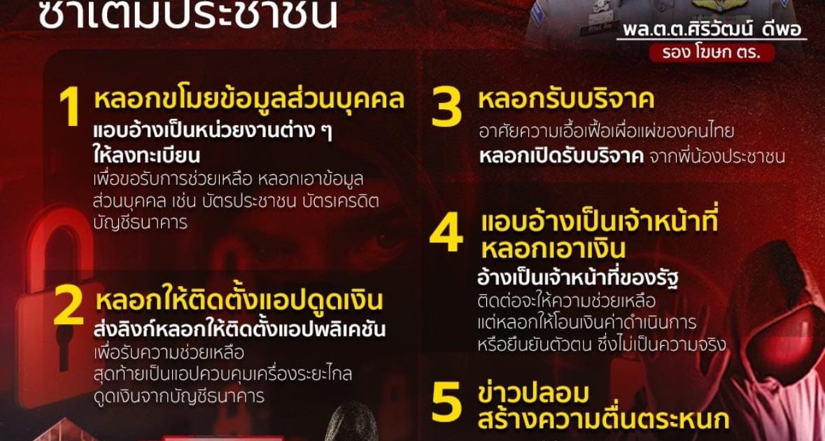 สำนักงานตำรวจแห่งชาติจึงขอเตือนให้พี่น้องประชาชนทราบถึง 5 มุกมิจฉาชีพ หลอกลวงประชาชน หลังเกิดแผ่นดินไหว ดังนี้