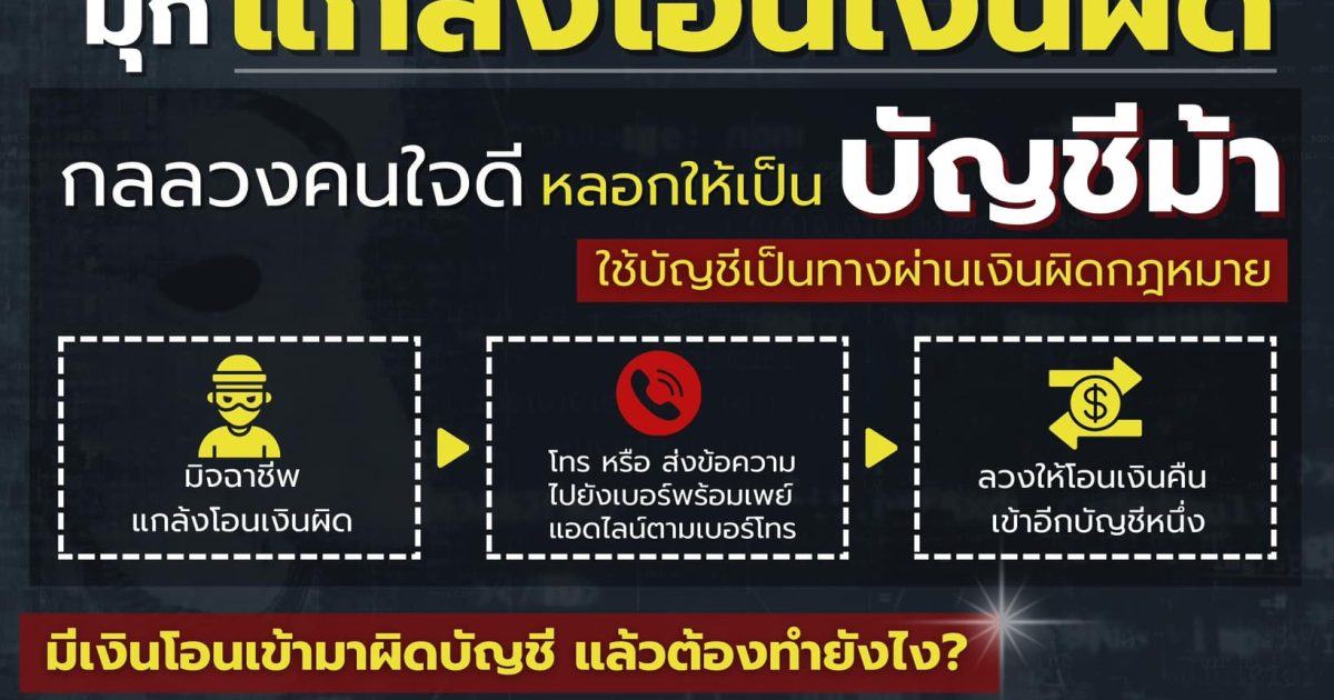 ข่าวฝากประชาสัมพันธ์ 30 มกราคม 2024 โดย adminTp811 / ข่าวประชาสัมพันธ์,ข่าวฝากประชาสัมพันธ์ รู้ทันโจรออนไลน์มุก “แกล้งโอนเงินผิดบัญชี”กลลวงคนใจดี หลอกให้เป็น “บัญชีม้า” มิจฉาชีพแกล้งโอนเงินผิดโทร หรือส่งข้อความมาตามเบอร์ที่ตรงกับบัญชีพร้อมเพย์ หรือแอดไลน์มาแจ้งว่าโอนเงินผิดบัญชี ขอให้โอนเงินคืน เข้าไปอีกบัญชีหนึ่ง หากหลงกลจะกลายเป็นทางผ่านเงินผิดกฎหมายเจอแบบนี้ #ไม่เชื่อไม่รีบไม่โอนรู้ไว้ 5 สิ่งต้องทำเมื่อมีเงินโอนเข้ามาผิดบัญชีไม่โอนคืนเอง และไม่นำเงินไปใช้ขอชื่อ-สกุล และเบอร์ติดต่อกลับ ของผู้ที่โทรหาเราไว้ด้วยรีบติดต่อธนาคาร เพื่อตรวจสอบว่าโอนมาผิดบัญชีจริงหากโอนเงินผิดบัญชีจริง ธนาคารจะติดต่อขอให้เรายินยอมให้ธนาคารเป็นผู้ดำเนินการดึงเงินกลับไปยังบัญชีต้นทางให้ลงบันทึกประจำวันที่สถานีตำรวจไว้เป็นหลักฐาน เพื่อแสดงความบริสุทธิ์ใจด้วยความปรารถนาดีจาก “สำนักงานตำรวจแห่งชาติ”แจ้งความออนไลน์ ที่เว็บไซต์ www.thaipoliceonline.go.th เท่านั้น( ที่มา : สืบนครบาล IDMB )