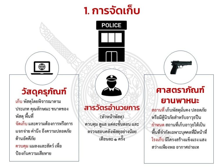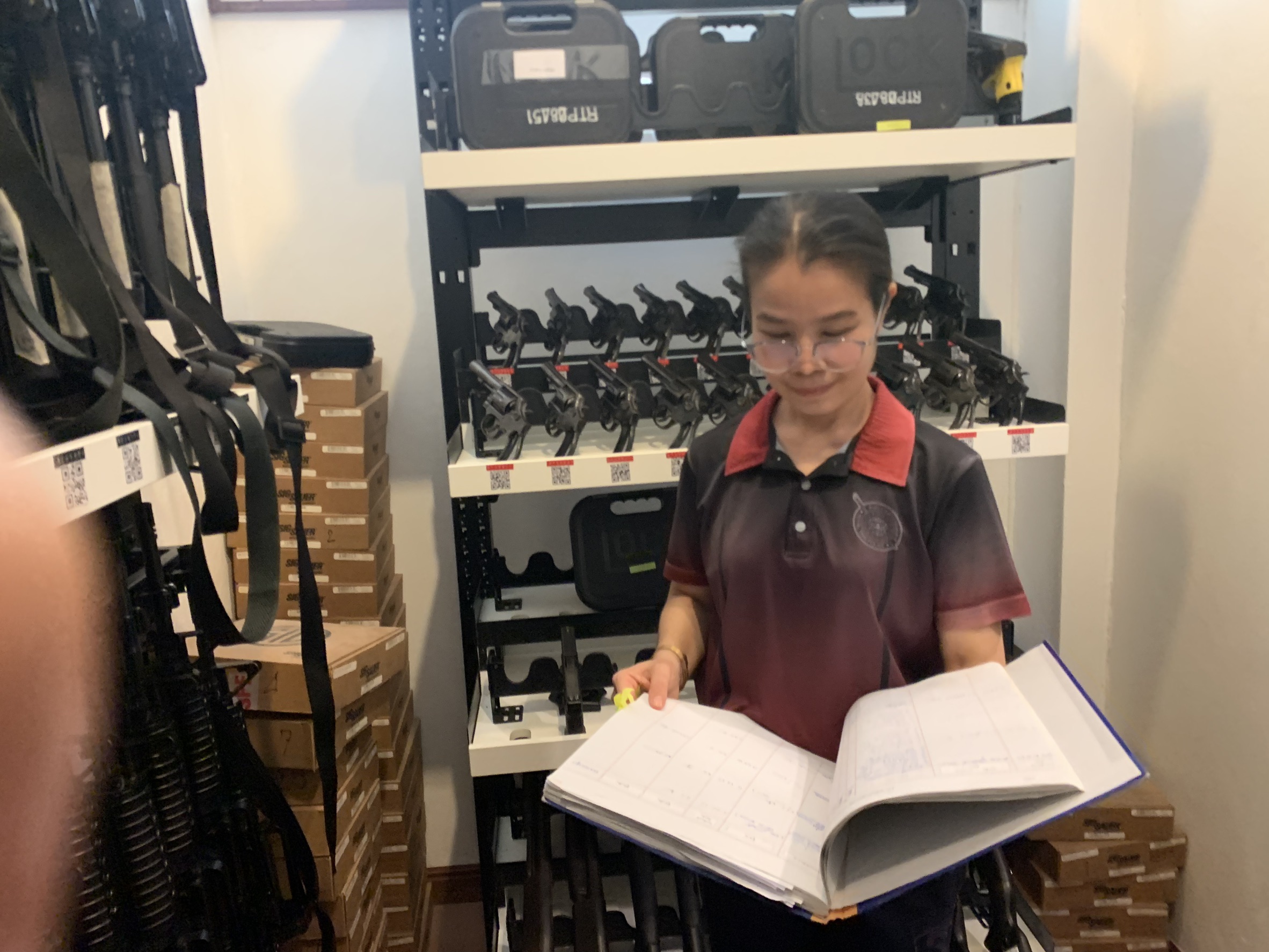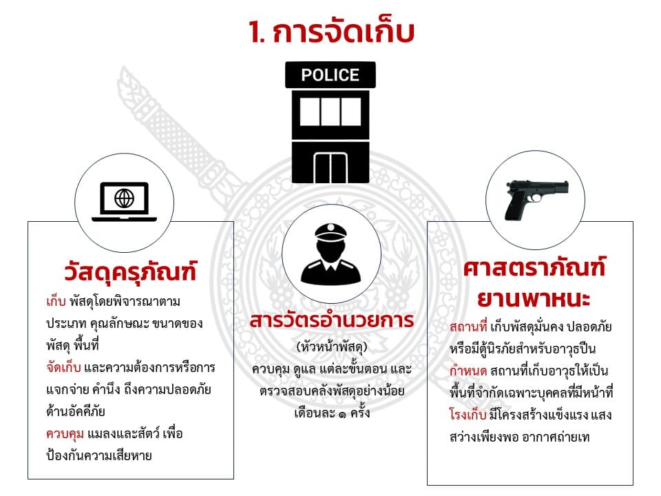มีการจัดเก็บอาวุธปืน เครื่องยุทธภัณฑ์ ไว้ในที่มั่นคงแข็งแรง มีเจ้าหน้าที่รับผิดชอบดูแล และมีการจัดทำบัญชีควบคุมอย่างเป็นระบบ